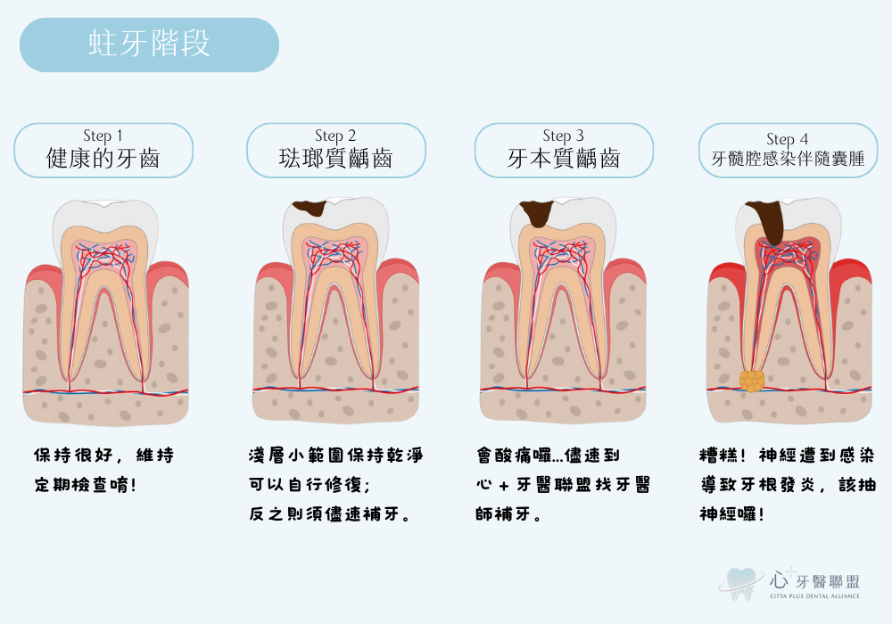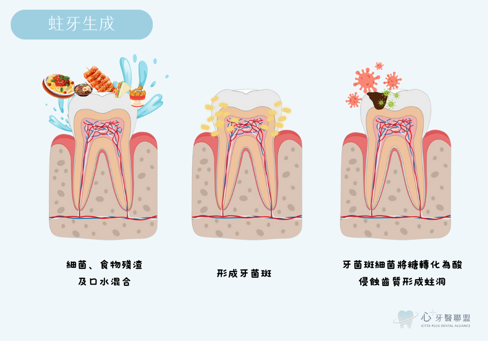 一般來說,蛀牙形成需要一段時間,從幾個月到幾年都有可能,取決於平時的清潔、飲食習慣或基因遺傳等。蛀牙的前身-牙菌斑是由細菌、食物殘渣及口水混合而成。食物中糖分越高且停留時間越長,形成的牙菌斑越多,而牙菌斑的細菌會將糖轉化為酸。牙齒的礦物質會試圖抵抗酸的侵蝕,同時細菌產生的酸會不斷溶解牙齒,一來一往之下,若細菌繁殖速度比鈣化快,齲齒的範圍就會越大或是越深。